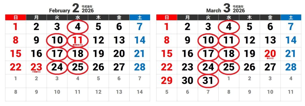 2月及び3月の弊社定休日は、下記カレンダーにてご確認くだい。