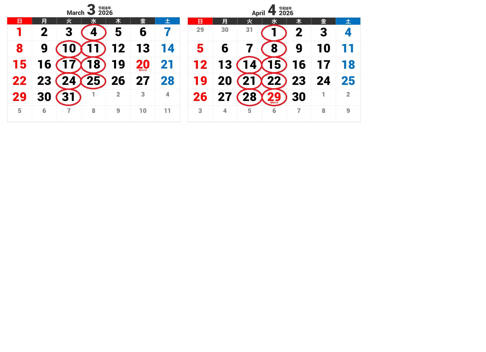 3月及び4月の弊社定休日は、下記カレンダーにてご確認くだい。